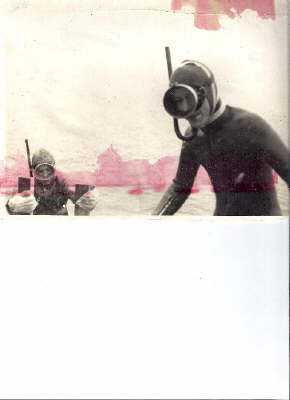 I think my grandmother took this picture, or possibly my brother, it was probably 1963 or 64. Mark and I finally raked enough blueberries to buy wetsuits. This was in March, off our dock. It was snowing hard. We swam in the only open water on the lake due to the current at the dam. Mark....we did swim out to the edge of the ice and back, right? I think it halfway shows up through the snow and fog just over your head. Mark on the right, me on the left, we are both coming out of the water, obviously darn cold. Note my high tech winter diving gloves, 100% cotton, wrapped in a baggie. I remember mostly that my chin was so numb from the cold that I had a hard time keeping the snorkel in my mouth. Sorry about the stain. Probably blueberry. Jeff